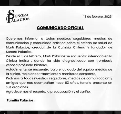 “Queremos informar a todos nuestros seguidores, medios de comunicación y comunidad artística sobre el estado de salud de Marti, creador de la Cumbia Chilena y fundador de Sonora Palacios”, manifestaron de entrada.