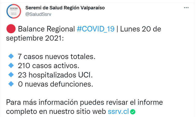REGIONAL.- 7 nuevos casos de Covid-19 se han reportado en la última la jornada acorde al último informe emitido por la SEREMI de Salud de Valparaíso, elevando así la cifra total a 122.981 contagiados desde el inicio de la pandemia.
