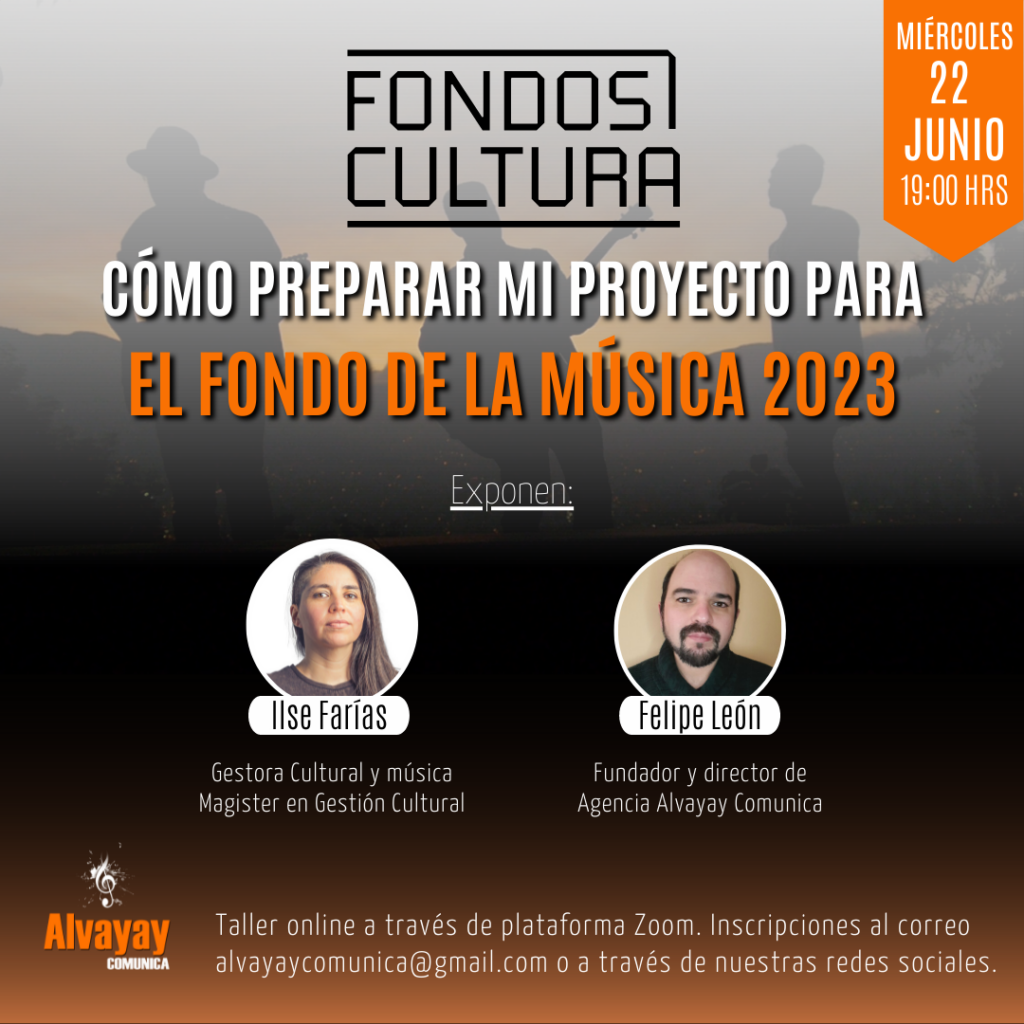En esa línea, la Agencia Alvayay Comunica realizará un taller online dirigido a músicos y agentes de la industria musical en general que deseen aprender cómo preparar sus proyectos para postular al Fondo de la Música 2023. La actividad se desarrollará este miércoles 22 de junio, a las 19 horas, a través de la plataforma Zoom.