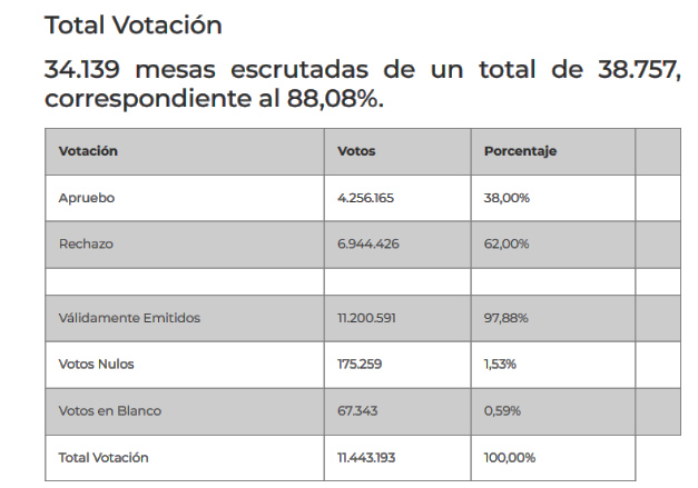 Un cómodo triunfo logró la opción Rechazo al sumar un 62%. de respaldo con un 88% de los votos sufragados. En tanto, el Apruebo alcanza sólo un 38% de los votos contabilizados.