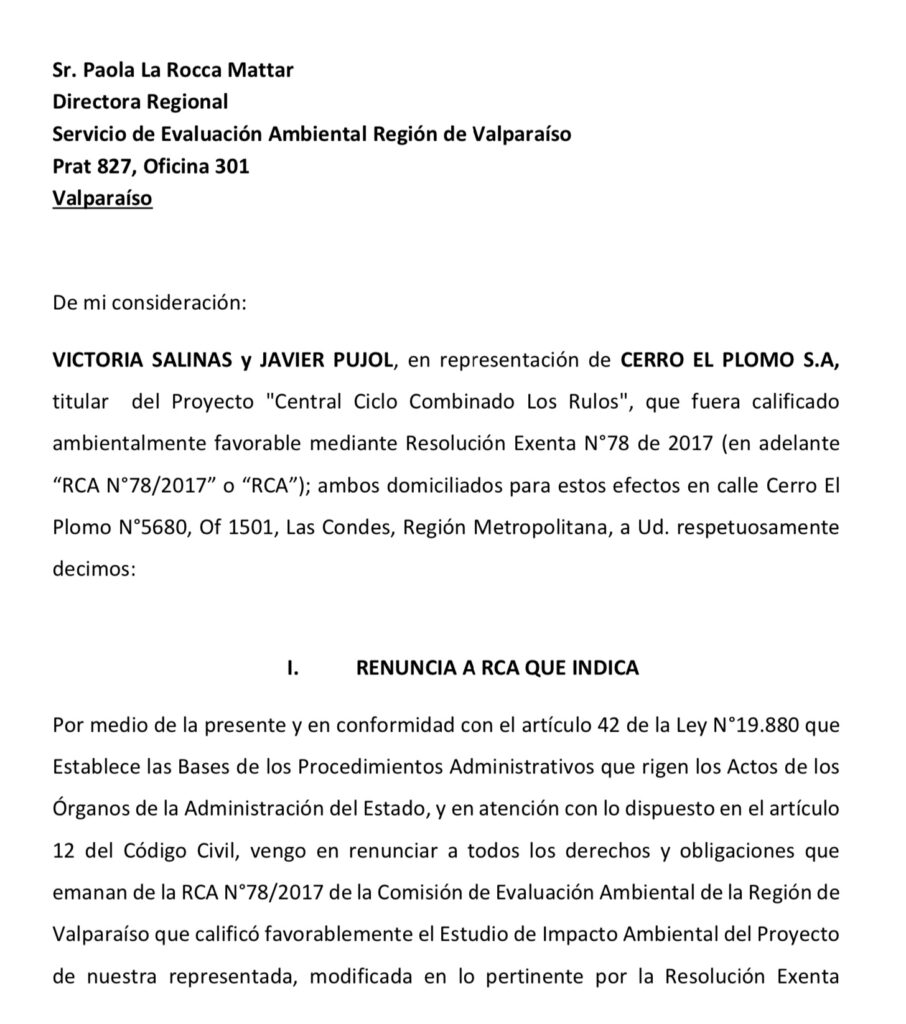 “Vengo en renunciar a todos los derechos y obligaciones que emanan de la RCA N°78/2017 de la Comisión de Evaluación Ambiental de la región de Valparaíso, que calificó favorablemente el Estudio de Impacto Ambiental del proyecto de nuestra representada, modificada en lo pertinente por la Resolución Exenta N°202299101481/2022, que acogió parcialmente recursos de reclamación en su contra”, señaló la empresa, en documento firmado por Victoria Salinas y Javier Pujol.