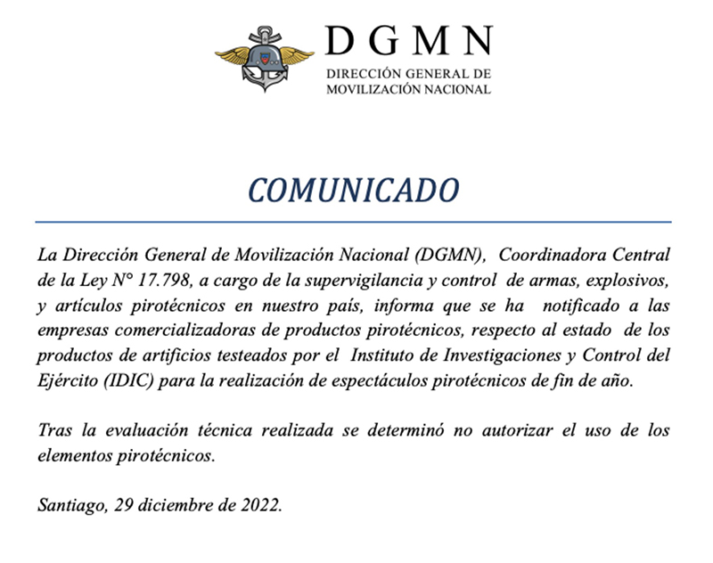 La decisión responde a un documento emitido por la empresa Pirotecnia Igual, de España, que manifestaba su preocupación por el estado en que se encuentran todos los artificios pirotécnicos exportados a Chile durante el 2019, pese a que tenían como fecha de caducidad el 2024.