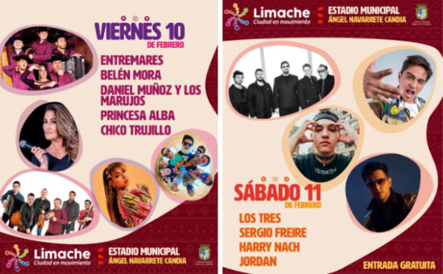 Durante las jornadas artísticas actuarán: Entremares, Daniel Muñoz y Los Marujos, Princesa Alba y Chico Trujillo (viernes 10) y el grupo Los Tres, Jordan y el popular artista del género urbano Harry Nach (sábado 11).