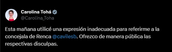 Cabe señalar que la secretaria de Estado, a través de su cuenta de X, admitió haberse equivocado: “Esta mañana utilicé una expresión inadecuada para referirme a la concejala de Renca @cavilesb. Ofrezco de manera pública las respectivas disculpas“.