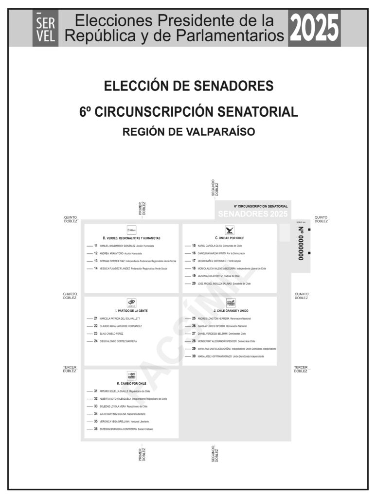 Los facsímiles pueden ser consultados en esta misma pagina como el pagina www.servel.cl donde se encuentran organizados por territorio y tipo de elección. Las autoridades recordaron que estos modelos no tienen validez para votar, pero cumplen un rol fundamental en materia educativa y de transparencia.